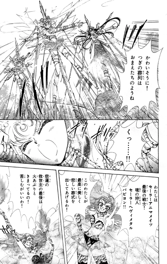 After Sailor Chi and Sailor Phi take away the Sailor Starlights' Sailor Crystals, Eternal Sailor Moon, Princess Kakyuu, and Sailor Chibi Chibi continue their journey to find Sailor Galaxia. Eventually, they find themselves in a graveyard in the middle of a fog, where they face another new enemy: Soul Hunter Sailor Heavy Metal Papillon.