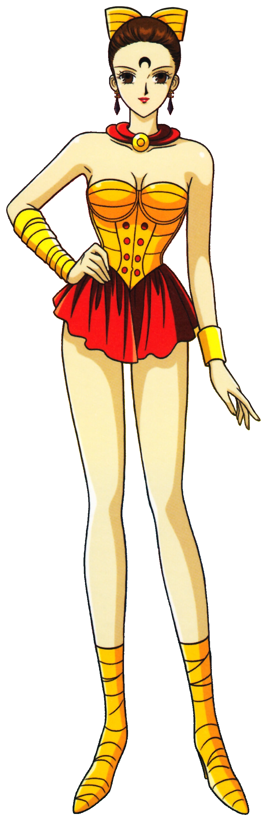 Calaveras has light brown hair and light brown eyes. She wears her hair in a bun and with a big gold ribbon in it. Her outfit consists of a golden sleeveless top, a red sailor-like collar, gold bracelets on her wrists, a red skirt, and golden boots.