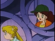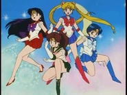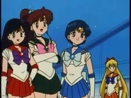 Then, they hear the scream of a girl. They find the fake Sailor Moon hanging on a rope. They also see Kunzite. Usagi wants to save her. But Ami says that it might be a trap. Usagi says that she can't stand seeing Sailor Moon that way. So they transformed.