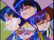 Kunzite is watching the lights of the city. He says, "What a waste of light. I want to see the darkness." Sailor Moon says, "I won't let you. That's a bad hobby to tie up girls like that." Then, the Sailor Guardians appear in front of Kunzite. But Kunzite traps the Sailor Guardians in a large dome. Sailor Mars tries her Fire Soul attack, but the energy is sucked by the barrier. Then Kunzite attacks them. The Sailor Guardians are scattered away. Sailor Jupiter tries her Supreme Thunder attack. Again, the energy is sucked by the barrier. Then Kunzite says, "Is that the strength of the Sailor Guardians?" Kunzite makes the dome smaller and smaller, trapping the Sailor Guardians closer together.