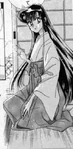 Unlike the other Sailor Guardian’s school uniforms, her school uniform is very stylish and classy and reflects the elite status of her private school. She wears a gray blouse that has a black collar with dark red stripes on it, a dark red bow, a black skirt, white socks with a dark red stripe, and black shoes. When she becomes a high school student in Stars, the dark red bow on her shirt becomes black. Another outfit she is often seen wearing is her red and white shrine priestess robes. She also always wears her pendant.