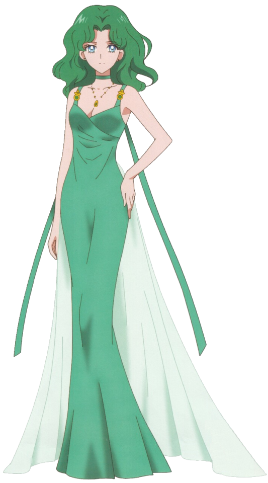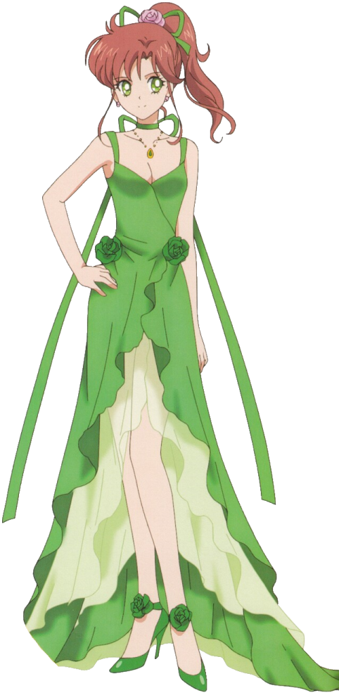 Princess Jupiter wore a green dress with a split down the middle of her skirt. She had a rose in her hair and two at her hips. She also wore her rose earrings, a green choker and necklace and green heels with a strap across the ankle. She had Io Castle which orbits Jupiter. She also guarded Princess Serenity.