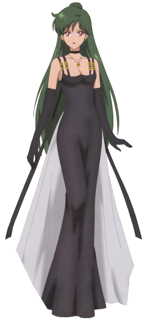 Princess Pluto wore a black gown with four straps, a choker, high heels and gloves. She had the Charon Castle which orbits Pluto. She protected the Silver Millennium from outside threats who would approach through other dimensions or through time and stood by the Door of Space and Time.