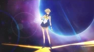 Haruka then holds out the Lip Rod while she spins and forms a circle outline of wind around her. She then brings her arms close to herself before the wind rises surrounding her. Once the wind is gone Uranus pushes her hair back and her lip gloss is applied. She then spins around before striking her pose.